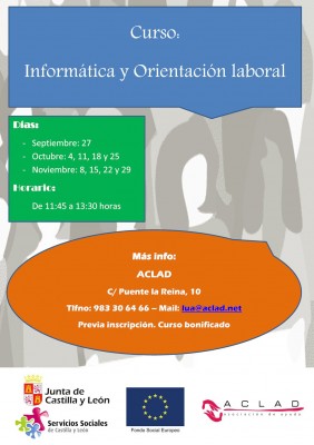 Aclad impartirá un curso de ‘informática y orientación laboral’ durante el último trimestre del año. Las sesiones previstas se celebrarán en las sedes de nuestra asociación ubicadas en: Valladolid, Palencia, León y Burgos. El plazo de inscripción concluirá a finales de este mes.